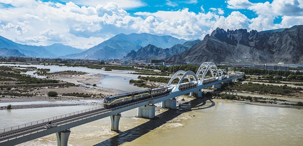 青藏铁路拉萨河特大桥上一列火车驶过。目前,西藏的现代交通运输体系基本建成。旦增西旦摄
