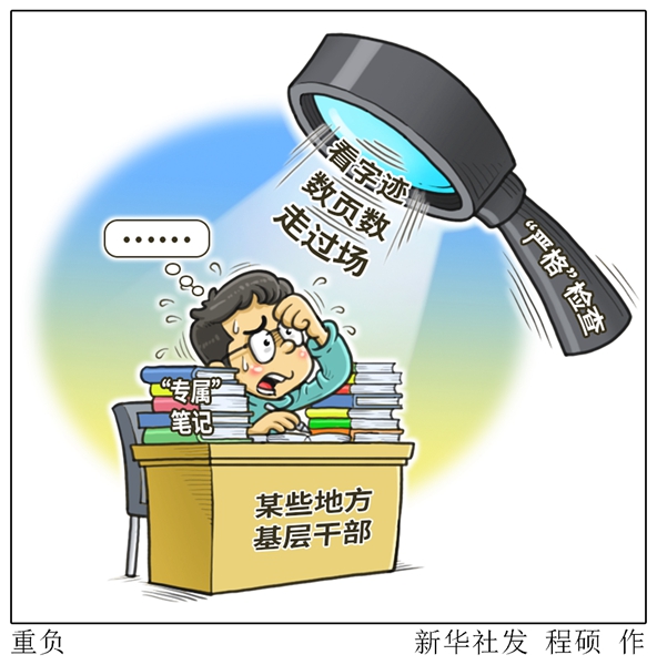 近年来,一些地方的基层干部手中小小的笔记本成为如山重负。凡有活动必有“专属”笔记,凡是笔记必要“严格”检查。一些乡镇干部手头甚至备着十多个笔记本,专本专用,应付不同检查事项。在农村,一些年纪大的党员眼花手慢,为了凑够整个支部的笔记本数量,只能让年轻党员挑灯夜战换着字迹多抄几本。而所谓“严格”检查,无非就是看字迹、数页数,走过场。一名干部反映,写了两页半的学习心得被批评不够“深刻”,得再“划拉”半页才能过关。