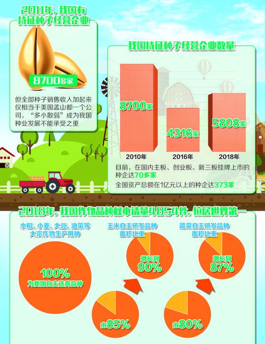 面对来势汹汹的“洋种子”,中国种企奋力突围,国家种子工程、生物育种能力建设等专项和税收减免优惠政策实施,着力扶持大型育繁推一体化企业。“2016年,种企数量出现拐点,之前企业数量减少一半,之后逐步回升。”农业农村部种业管理司副司长吴晓玲说,2018年种子企业达5808家,较2010年减少2892家,较2016年最低数增加1492家。目前,在国内主板、创业板、新三板挂牌上市的种企达70多家,全国资产总额在1亿元以上的种企达373家。