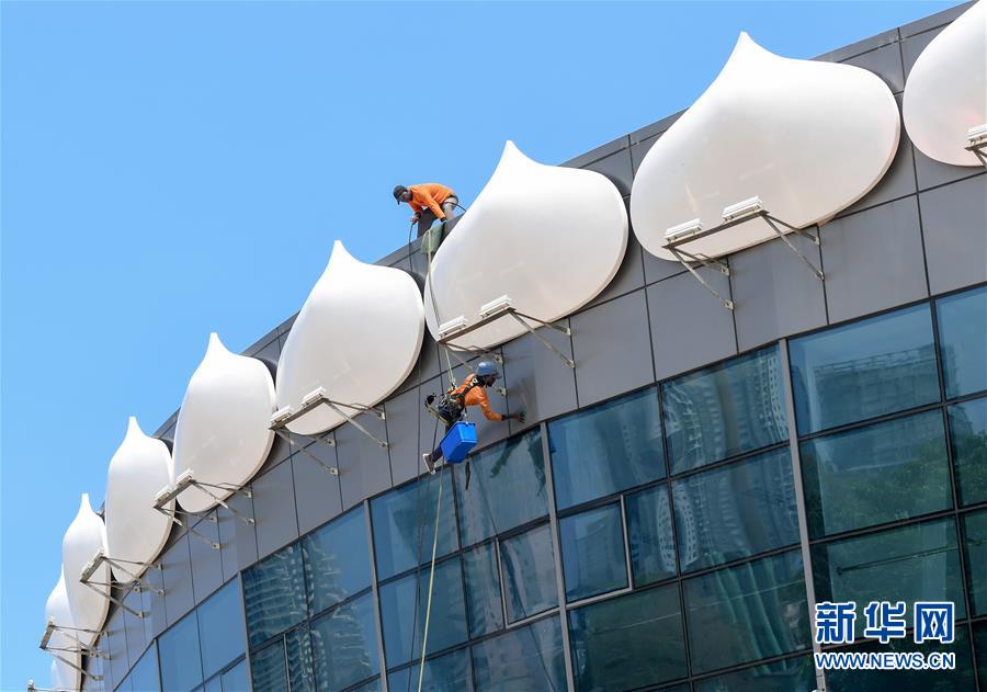 4月10日,在斯里兰卡科伦坡,工人在莲花电视塔进行清理工作。