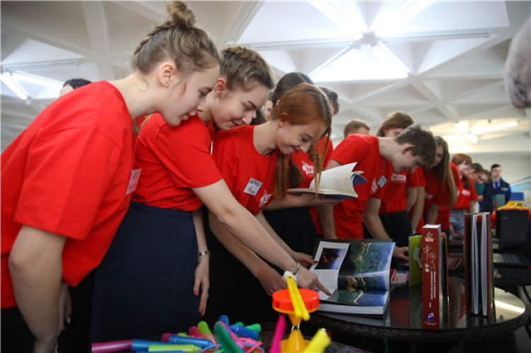 1月16日,在俄罗斯符拉迪沃斯托克的“海洋”全俄儿童中心,俄罗斯青年观看中国政府赠送的礼物。新华社记者 吴刚 摄