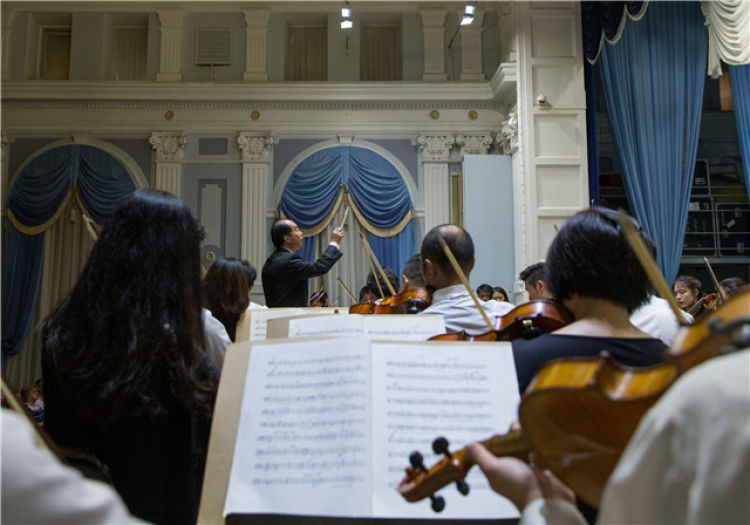 2016年7月6日,中国爱乐乐团、中央少年广播合唱团与俄罗斯伊尔库茨克州交响乐团在俄罗斯伊尔库茨克联合举办了一场彰显中俄友谊的高规格音乐会,这是中国爱乐乐团在音乐会上演奏。新华社记者 白雪骐 摄