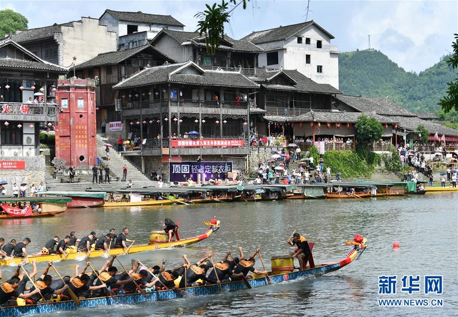 6月6日,在湖南省花垣县边城镇清水江上,龙舟队在比赛。 端午将至,各地举行传统龙舟赛。人们驾舟竞渡,迎接传统节日的到来。 新华社发(龙恩泽摄)