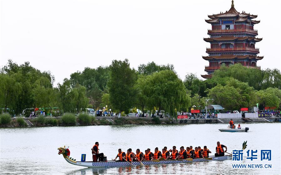 6月6日,在甘肃张掖市高台县,龙舟赛选手在大湖湾水库景区竞逐。 端午将至,各地举行传统龙舟赛。人们驾舟竞渡,迎接传统节日的到来。 新华社发(王将摄)