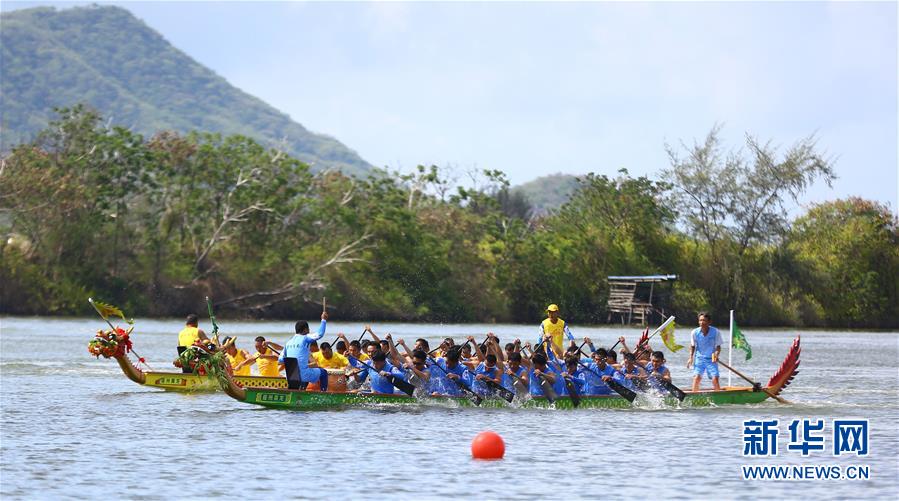 6月6日,龙舟队队员在海南三亚崖州区宁远河上赛龙舟。 端午将至,各地举行传统龙舟赛。人们驾舟竞渡,迎接传统节日的到来。 新华社发(陈文武摄)