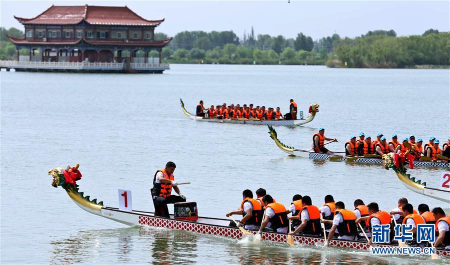 6月6日,在甘肃张掖市高台县,龙舟赛选手在大湖湾水库景区竞逐。 端午将至,各地举行传统龙舟赛。人们驾舟竞渡,迎接传统节日的到来。 新华社发(王将摄)