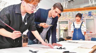在中国石油大学(华东)的学生活动中心,塔吉克斯坦留学生安晨(左二)在学习书法。新华社发