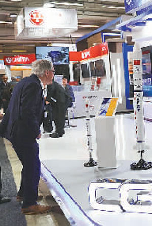 在第53届巴黎-布尔歇国际航空航天展览会上,观众在中国航空航天企业的展台参观。新华社发