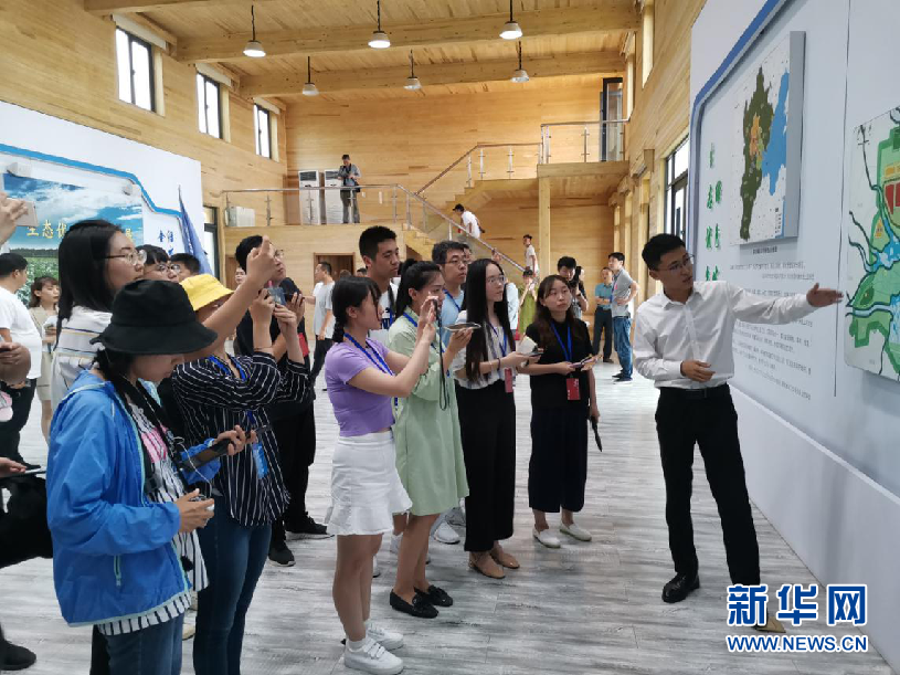 工作人员向采访团成员讲解雄安新区“千年秀林”植树造林进展。新华网崔利杰 摄