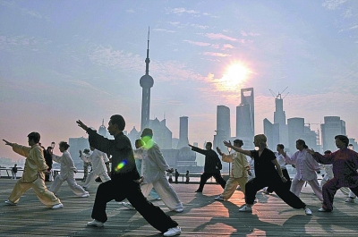 清晨,太极爱好者在上海外滩陈毅广场锻炼身体。新华社发