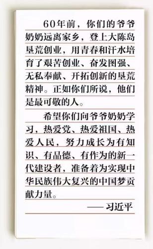 看到总书记的回信,大陈实验学校校长翁丽芬感触很深:“我们要以垦荒精神滋养孩子们的心灵,为海岛教育开垦出一片新天地!”