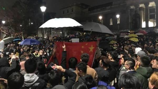 (原题为《中国留学生高唱国歌压制“港独”,冒雨为国旗撑伞》)