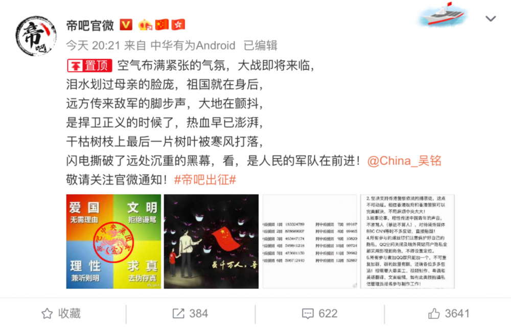 16日,帝吧官微在新浪微博发文称:爱国无需理由,文明拒绝谩骂,理性兼听则明,求真去伪存真!网友纷纷力挺并转发!