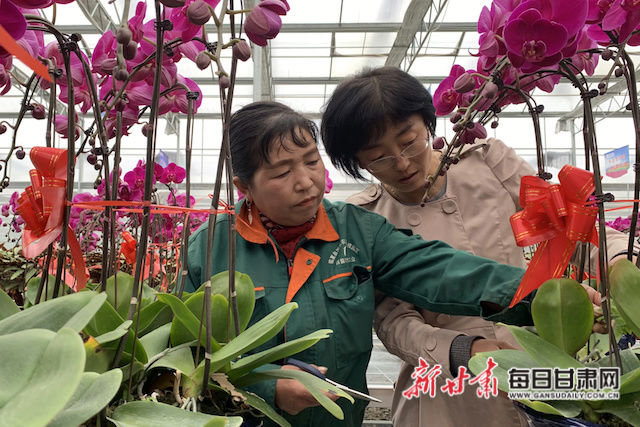 杨丽莹(右)正在指导王临喜修剪蝴蝶兰。