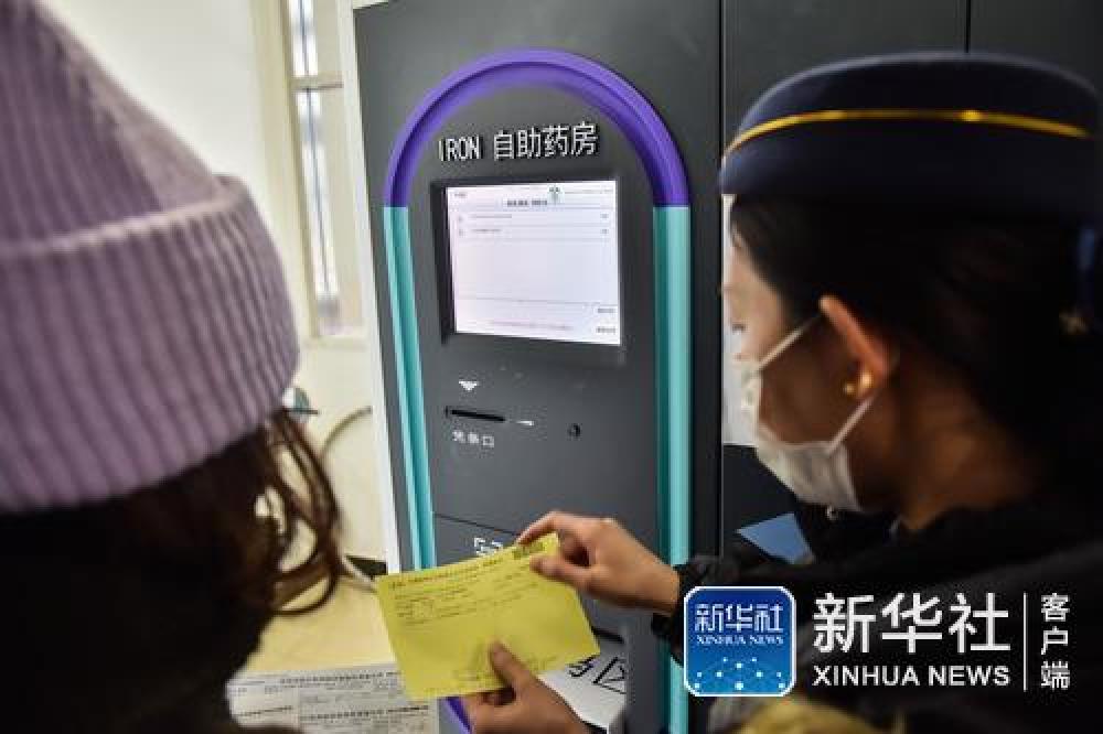 ↑1月5日,在北京友谊医院通州院区,病人在工作人员指导下使用自助药房取药。新华社发(彭子洋摄)
