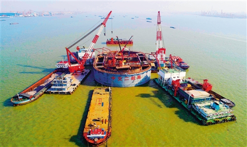 2月22日,位于江苏省泰州市常泰长江大桥第5号墩钢沉井建设工地,中交二航局建设者在对5号墩钢沉井夹壁进行混凝土浇筑。常泰长江大桥是世界上首座集高铁、普通公路、高速公路“三位一体”的大桥。 顾继红摄