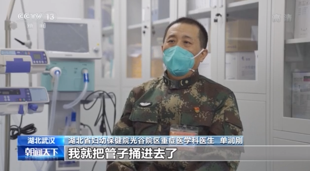 湖北省妇幼保健院光谷院区重症医学科医生、危重症患者救治突击队队员 单润刚:我们在吸气的时候,声门会变大,变大那一瞬间我就把管子插进去了,也就零点几秒,不到一秒钟。