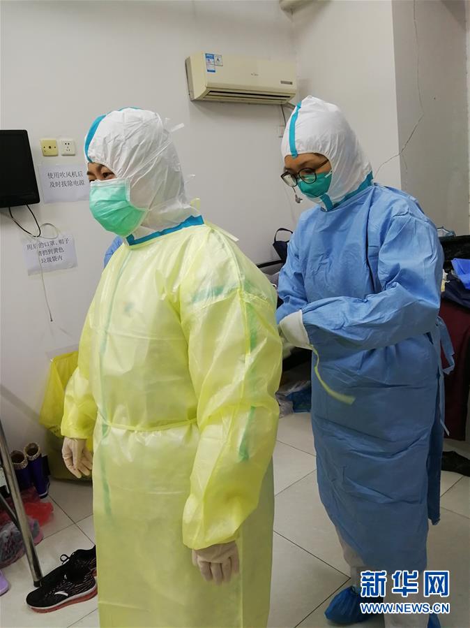 2月4日,路佳(右)帮助医生穿防护服。新华社发