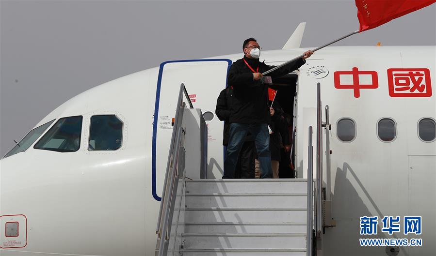 3月21日,甘肃第一批援助湖北医疗队队员返回兰州。这是蔡辉带队走出飞机。新华社发(杜哲宇 摄)
