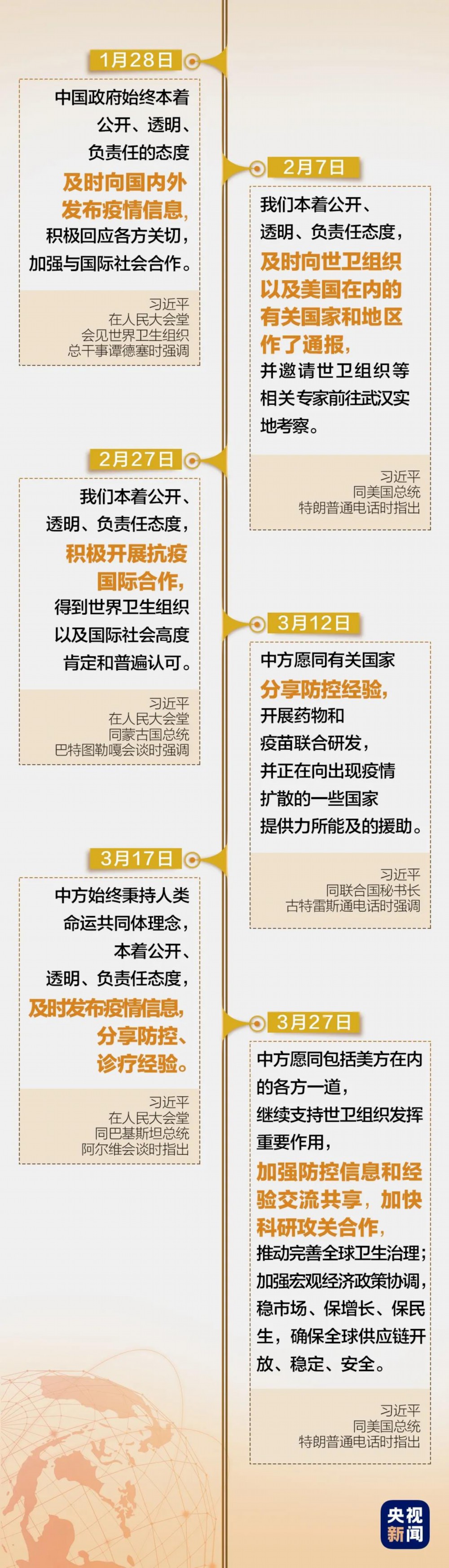 在与外方领导人和国际组织负责人的会谈、通话中,习近平多次表示,中国政府本着“公开、透明、负责任”的态度,及时向国内外发布疫情信息,积极回应各方关切,加强与国际社会合作。