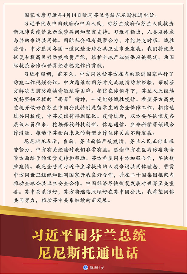 习近平强调,前不久,中方同包括芬方在内的欧洲国家举行了防疫工作视频会议。中方愿继续同芬方交流疫情防控经验,帮助芬方解决当前防疫物资短缺等困难。相信在你领导下,芬兰人民继续发扬坚韧不拔的“西苏”精神,一定能够战胜疫情。希望芬方高度重视并做好在芬兰中国公民特别是留学生的安全保障工作。相信通过共同抗疫,中芬友谊将得到深化。疫情过后,双方要尽快恢复各层级人员往来,挖掘释放科技创新、信息通信、生命科学等领域合作潜能,推动中芬面向未来的新型合作伙伴关系不断发展。