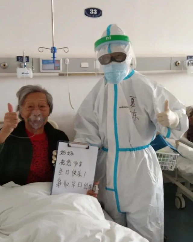 △3月18日,武汉大学人民医院东院区新冠肺炎21病区,医务人员为90岁的周太婆祝寿。