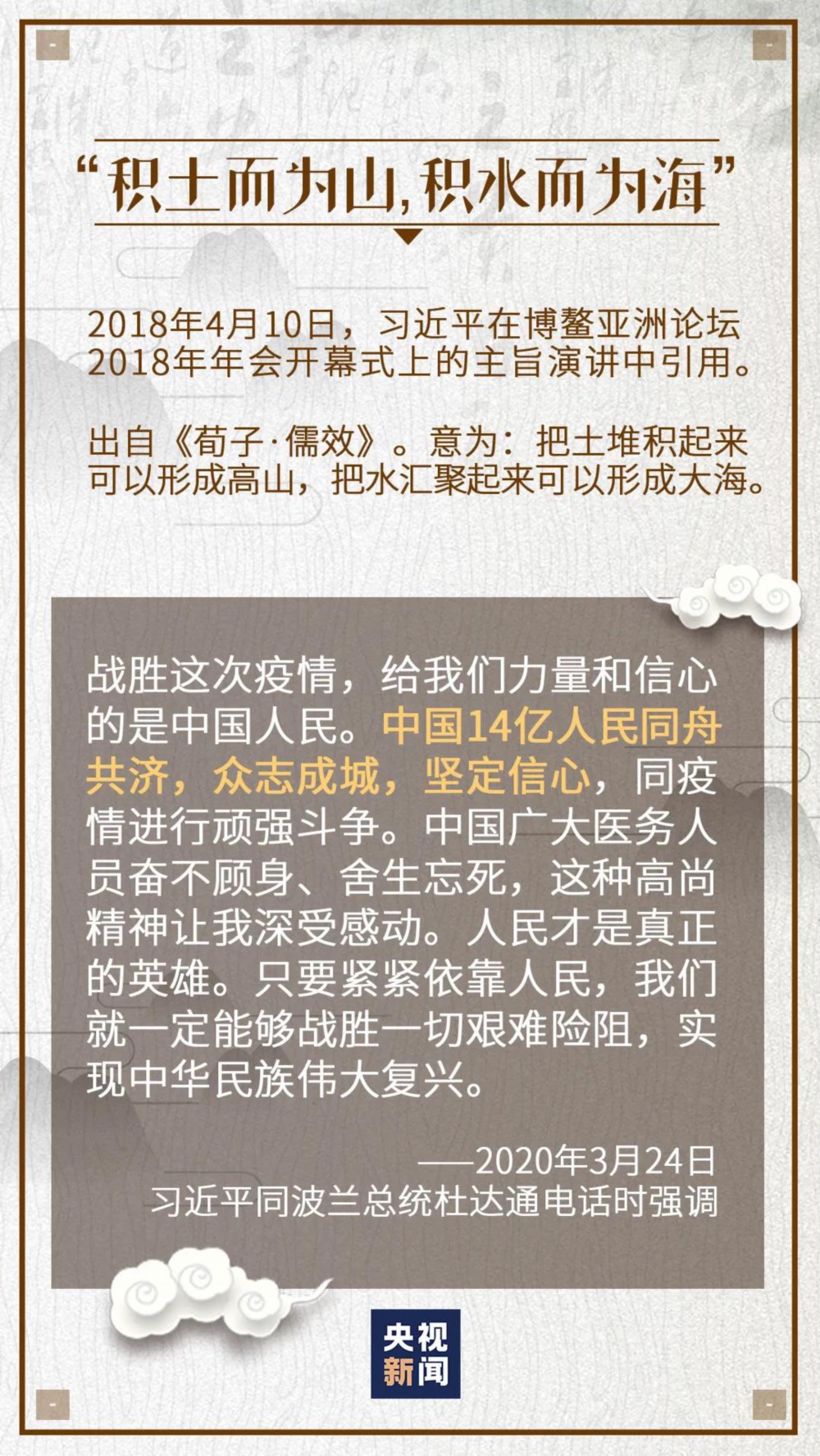 “积土而为山,积水而为海。”一个个普通人的力量汇聚成磅礴伟力,筑起了一道抗击疫情的钢铁长城。
