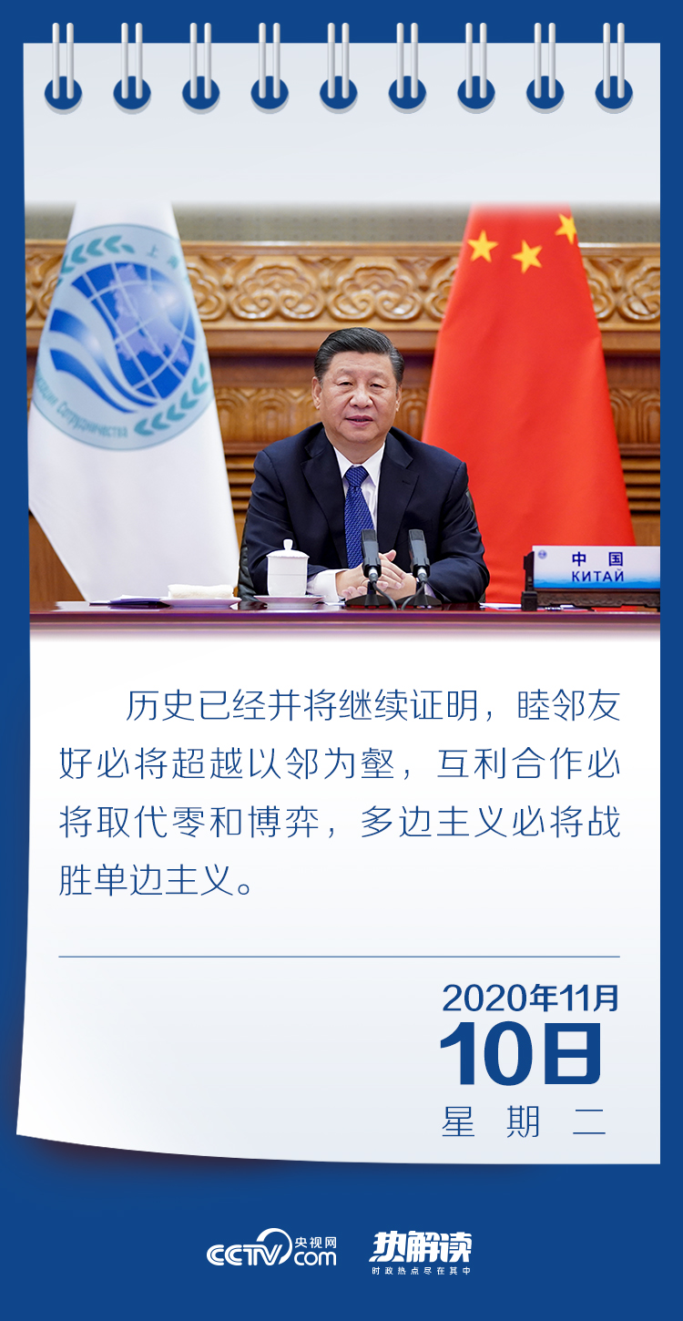 11月10日晚,习近平主席以视频方式出席上海合作组织成员国元首理事会第二十次会议,并发表题为《弘扬“上海精神” 深化团结协作 构建更加紧密的命运共同体》的重要讲话。