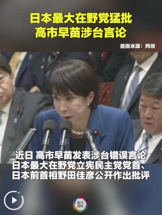 近日,日本首相高市早苗发表涉台错误言论。日本最大在野党立宪民主党党首、日本前首相野田佳彦和立宪民主党政务调查会长本庄知史16日发声,严厉批评高市早苗,称其涉台言论“越界”。(视频:罗林岚)