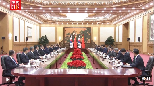 习近平指出,当前世界百年变局加速演进,国际形势更加变乱交织。中韩在维护地区和平、促进全球发展方面肩负重要责任,有广泛利益交集,应当坚定站在历史正确一边,作出正确战略选择。