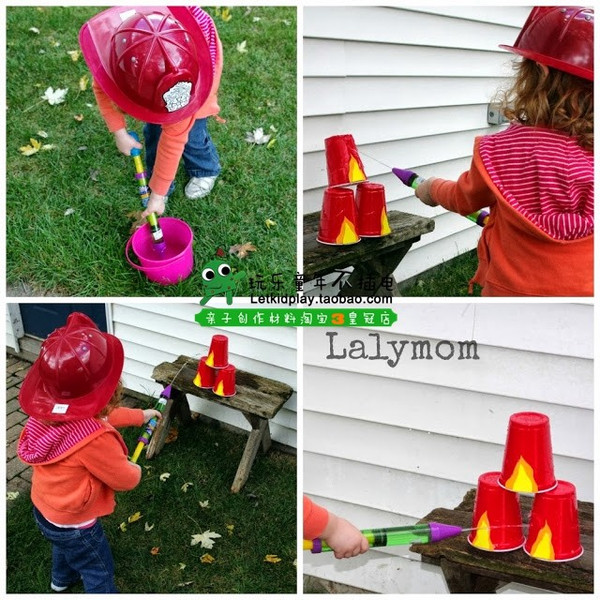 玩法②:三个一次性杯子画上火苗的图案,用滋水枪灭火!