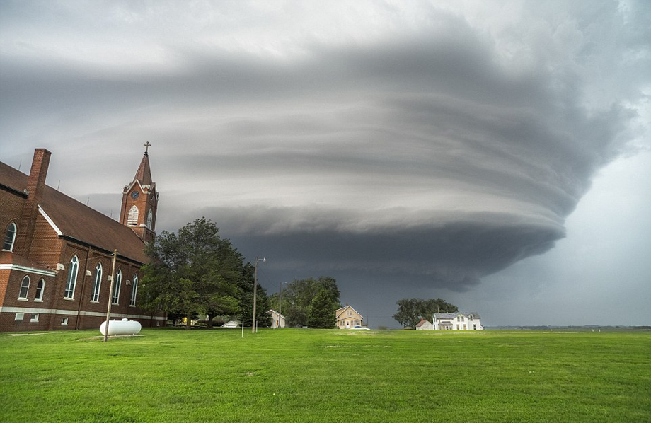 一个超级单体风暴正接近内布拉斯加州一座教堂。