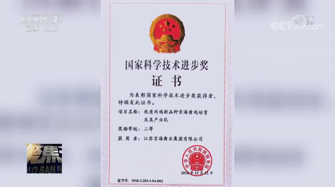 而获得国家科技进步二等奖的京海黄鸡,是目前我国唯一通过国家审定,具有自主知识产权的肉鸡新品种,已在全国推广2.69亿只。