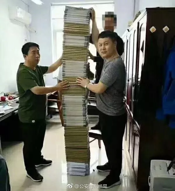照片拍摄于2018年5月,站在地上的31岁的赵亮(左)和33岁的张伟涛(右)扶着比人还高的卷宗,这些是他们不到半年的扫黑除恶成果。