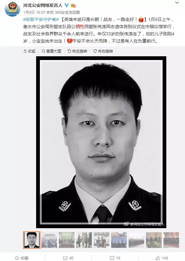 据了解,张伟涛1985年3月生,2012年参加公安工作,2013年到河北省衡水市公安局刑侦支队扫黑专业队工作,2017年获个人嘉奖,2018年荣立个人三等功。2019年1月6日,张伟涛同志在外出办案期间,因突发疾病,经抢救无效不幸殉职,年仅33岁。
