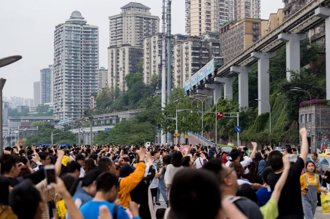 △5月2日,重庆市轻轨2号线李子坝站观景台,游客纷纷举起手机拍摄轻轨穿楼。
