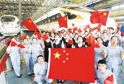 铁路员工在上海虹桥动车运用所开展“歌唱祖国,擦亮‘中国高铁’名片”快闪活动。新华社发