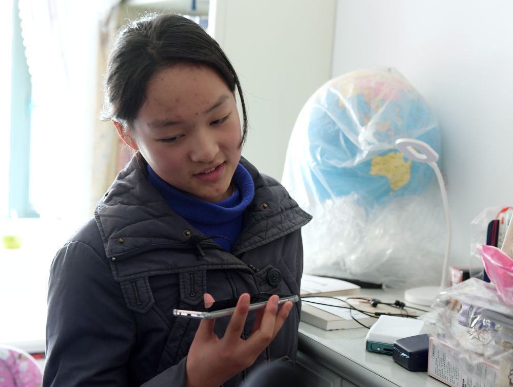 14岁的初中生孙婉清在家中使用手机和父亲通话(1月29日摄)。新华社记者 李贺 摄