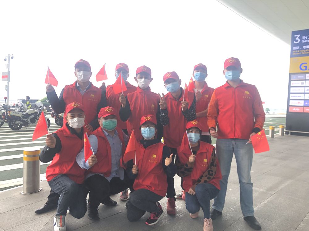 杨雪(前左三)和“守护天使”志愿者车队的队友们在一起(3月22日摄)。新华社发