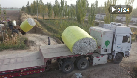 数台大型采棉机穿梭其间,朵朵棉花被采棉机采摘、收集、打包、出仓,棉田里一派丰收繁忙景象。