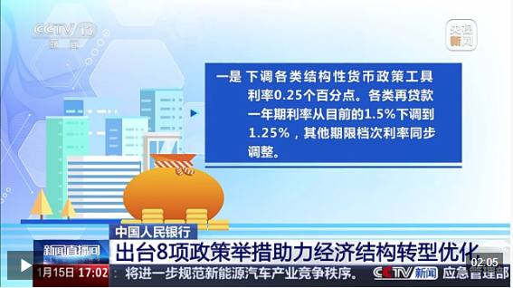 一是下调各类结构性货币政策工具利率0.25个百分点。各类再贷款一年期利率从目前的1.5%下调到1.25%,其他期限档次利率同步调整。