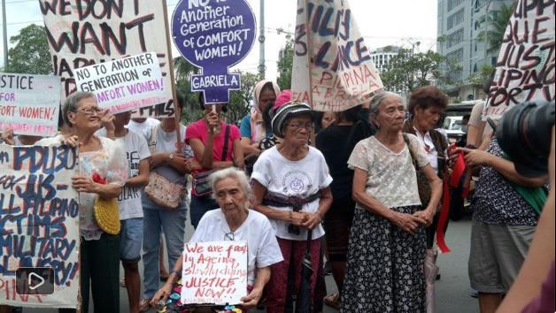 资料图:2017年1月12日,菲律宾多个民间团体在日本驻菲大使馆前举行集会抗议活动,要求日本政府向慰安妇受害者正式道歉、赔偿。图为4名菲籍慰安妇受害者参加当天抗议活动。中新社 记者 张明 摄